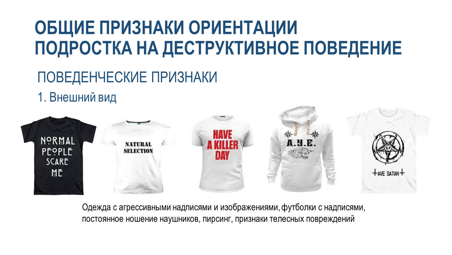 Одежда с агрессивными надписями и изображениями, футболки с надписями, постоянное ношение наушников, пирсинг, признаки телесных повреждений