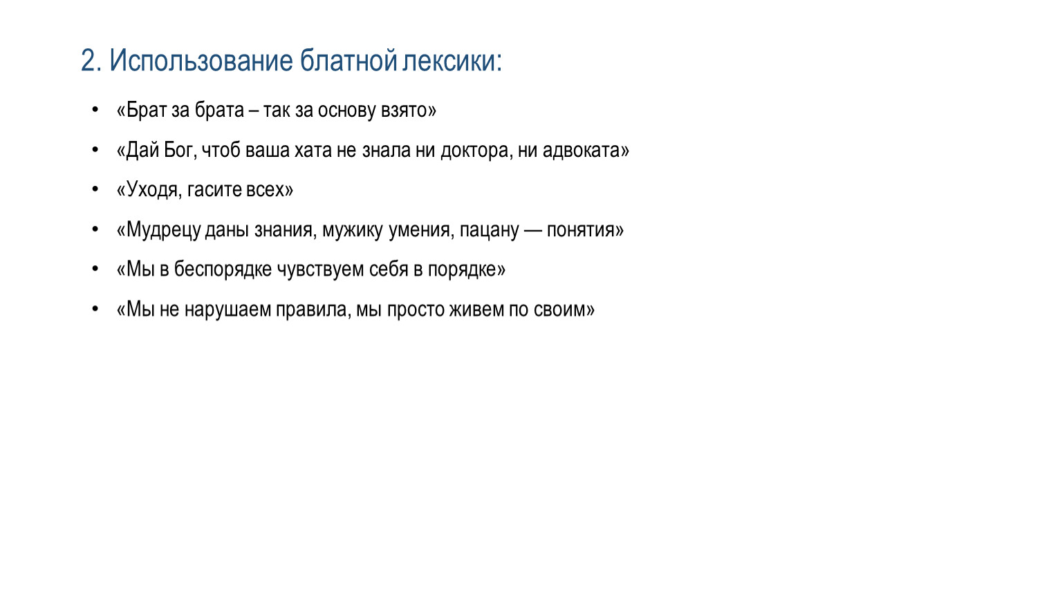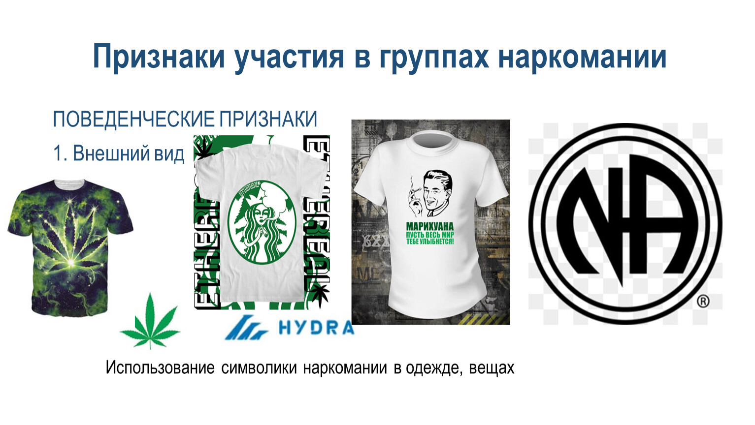 Использование сленга наркоманов, например, слов: гидра, закладка, кладмен, гаштет, баш, ханка, забуторить.