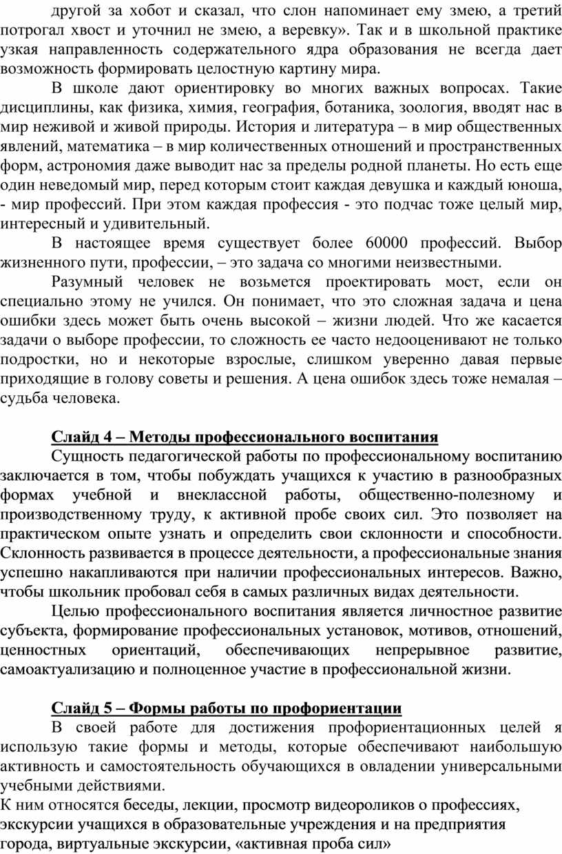 Сущность педагогической работы по профессиональному воспитанию заключается в том, чтобы побуждать учащихся к участию в разнообразных формах учебной и внеклассной работы, общественно-полезному и производственному труду, к активной пробе своих сил. Это позволяет на практическом опыте узнать и определить свои склонности и способности. Склонность развивается в процессе деятельности, а профессиональные знания успешно накапливаются при наличии профессиональных интересов. Важно, чтобы школьник пробовал себя в самых различных видах деятельности.