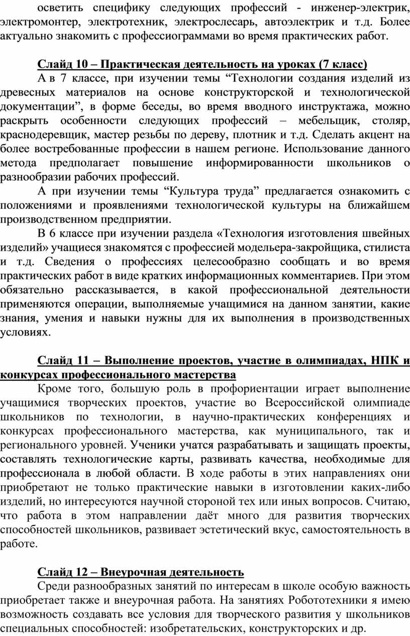 Кроме того, большую роль в профориентации играет выполнение учащимися творческих проектов, участие во Всероссийской олимпиаде школьников по технологии, в научно-практических конференциях и конкурсах профессионального мастерства, как муниципального, так и регионального уровней. Ученики учатся разрабатывать и защищать проекты, составлять технологические карты, развивать качества, необходимые для профессионала в любой области. В ходе работы в этих направлениях они приобретают не только практические навыки в изготовлении каких-либо изделий, но интересуются научной стороной тех или иных вопросов. Считаю, что работа в этом направлении даёт много для развития творческих способностей школьников, развивает эстетический вкус, самостоятельность в работе.