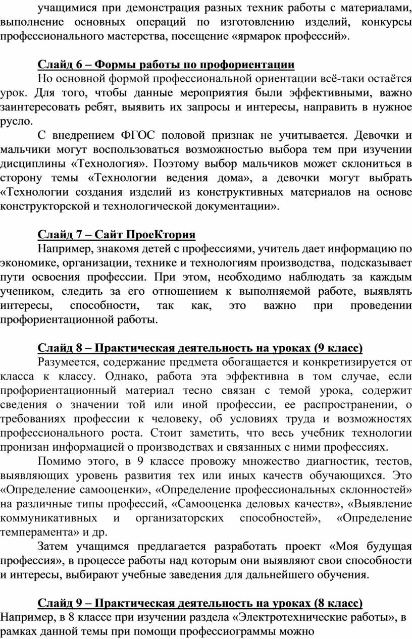 Разумеется, содержание предмета обогащается и конкретизируется от класса к классу. Однако, работа эта эффективна в том случае, если профориентационный материал тесно связан с темой урока, содержит сведения о значении той или иной профессии, ее распространении, о требованиях профессии к человеку, об условиях труда и возможностях профессионального роста. Стоит заметить, что весь учебник технологии пронизан информацией о производствах и связанных с ними профессиях.