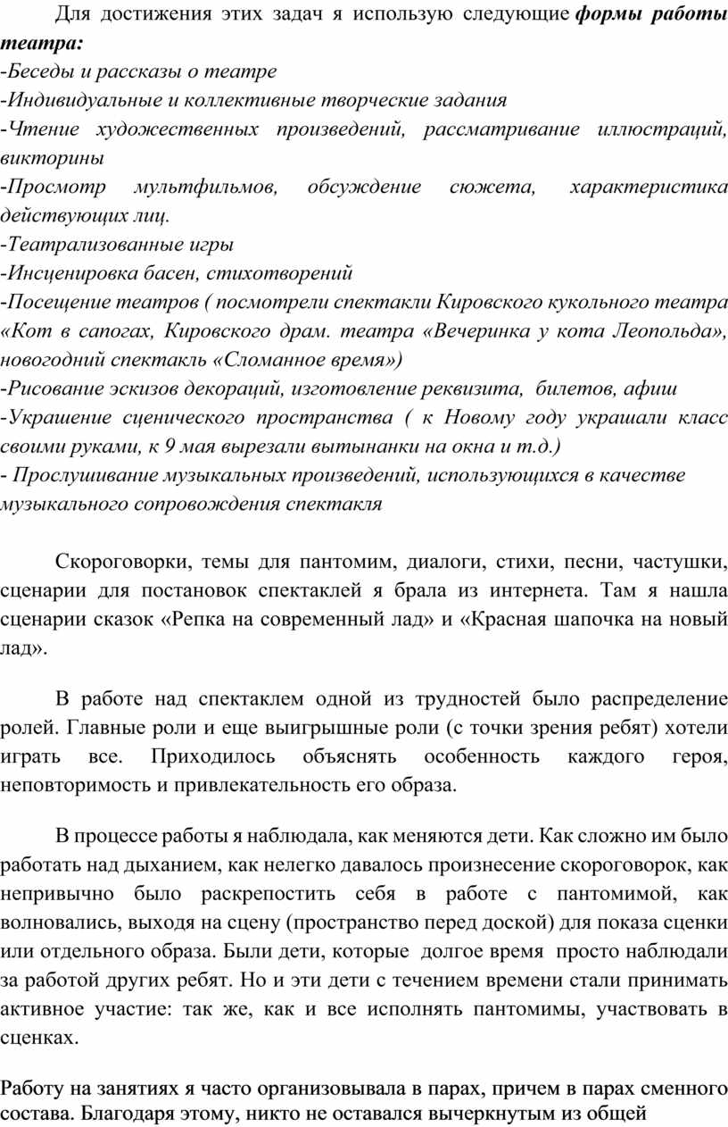 Теперь я знала, по каким направлениям строится работа театрального кружка. Это: основы театральной культуры, ритмопластика, культура и техника речи, театральная игра и работа над спектаклем. Я изучила цели и задачи каждого направления работы, ознакомилась с тем, к каким результатам в работе следует стремиться.