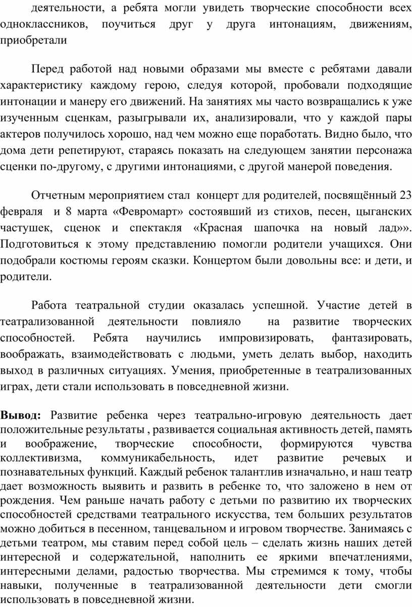Работа театральной студии оказалась успешной. Участие детей в театрализованной деятельности повлияло на развитие творческих способностей. Ребята научились импровизировать, фантазировать, воображать, взаимодействовать с людьми, уметь делать выбор, находить выход в различных ситуациях. Умения, приобретенные в театрализованных играх, дети стали использовать в повседневной жизни.
