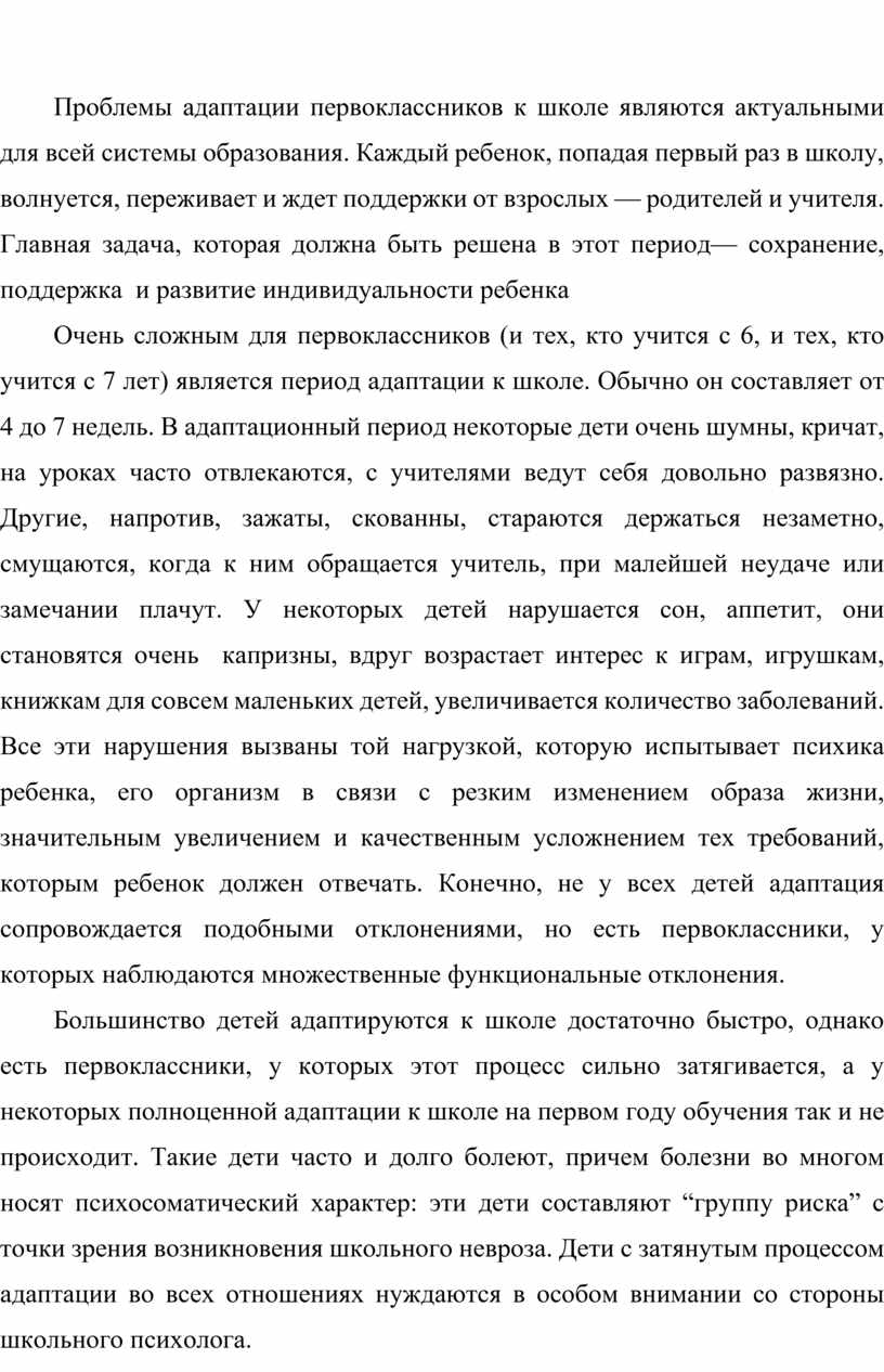 Большинство детей адаптируются к школе достаточно быстро, однако есть первоклассники, у которых этот процесс сильно затягивается, а у некоторых полноценной адаптации к школе на первом году обучения так и не происходит. Такие дети часто и долго болеют, причем болезни во многом носят психосоматический характер: эти дети составляют “группу риска” с точки зрения возникновения школьного невроза. Дети с затянутым процессом адаптации во всех отношениях нуждаются в особом внимании со стороны школьного психолога.