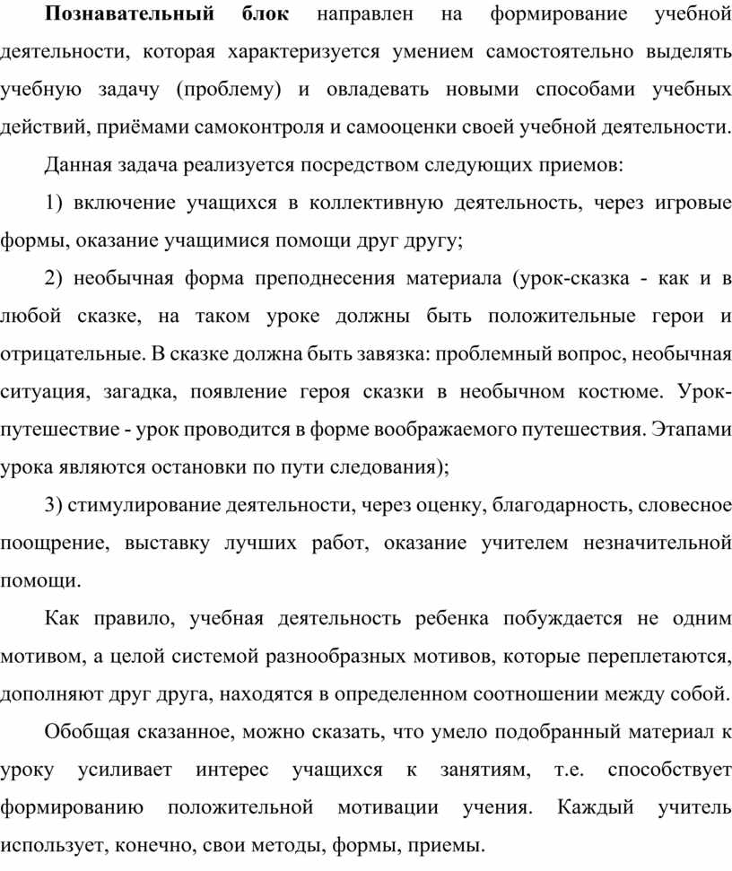 Познавательный блок направлен на формирование учебной деятельности, которая характеризуется умением самостоятельно выделять учебную задачу (проблему) и овладевать новыми способами учебных действий, приёмами самоконтроля и самооценки своей учебной деятельности.