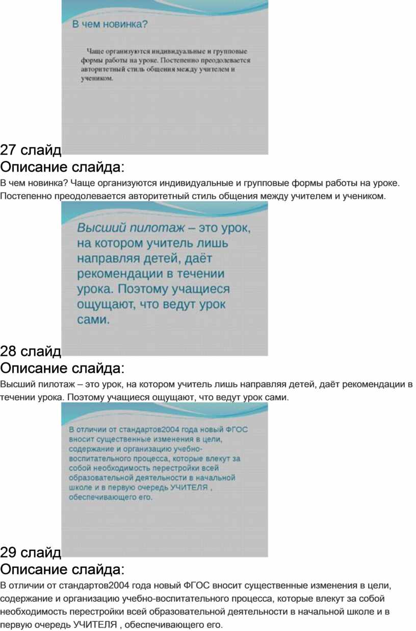 Чаще реализуются индивидуальные и групповые формы работы на уроке. Постепенно преодолевается авторитарный стиль общения между учителем и учеником.