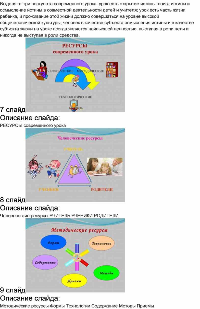 Выделяют три постулата современного урока: урок есть открытие истины, поиск истины и осмысление истины в совместной деятельности детей и учителя; урок есть часть жизни ребенка, и проживание этой жизни должно совершаться на уровне высокой общечеловеческой культуры; человек в качестве субъекта осмысления истины и в качестве субъекта жизни на уроке всегда является наивысшей ценностью, выступая в роли цели и никогда не выступая в роли средства.