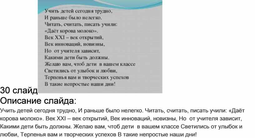 Учить детей сегодня трудно, И раньше было нелегко. Читать, считать, писать учили: «Даёт корова молоко». Век XXI – век открытий, Век инноваций, новизны, Но от учителя зависит, Какими дети быть должны. Желаю вам, чтоб дети в вашем классе Светились от улыбок и любви, Терпенья вам и творческих успехов В такие непростые наши дни!