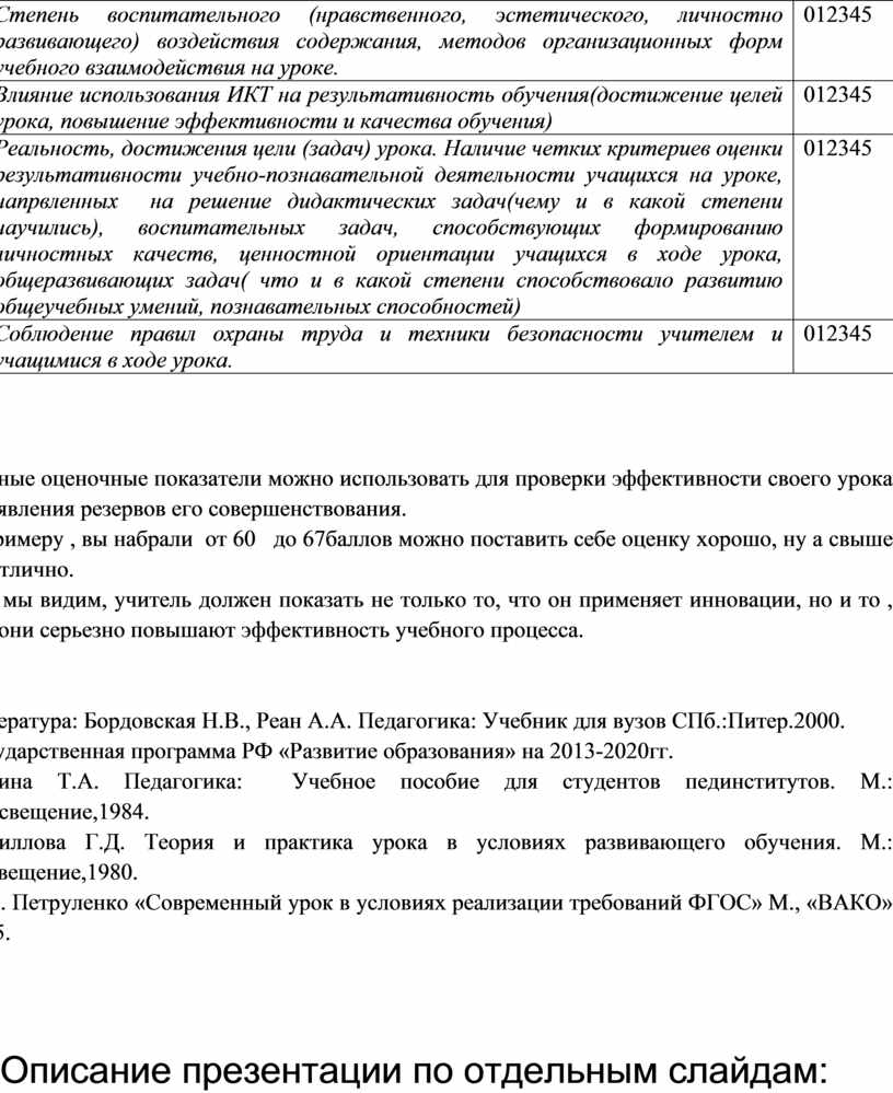 Данные оценочные показатели можно использовать для проверки эффективности своего урока , выявления резервов его совершенствования.