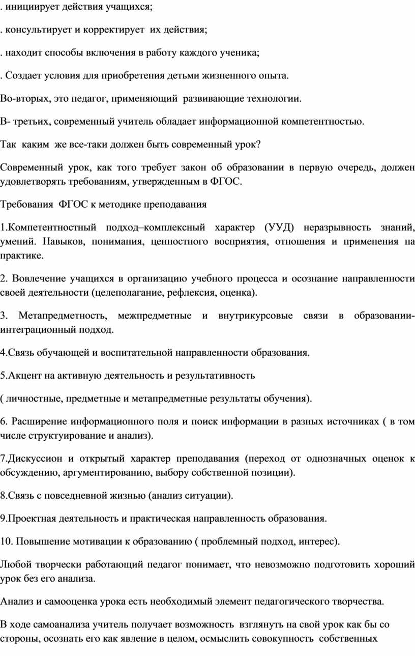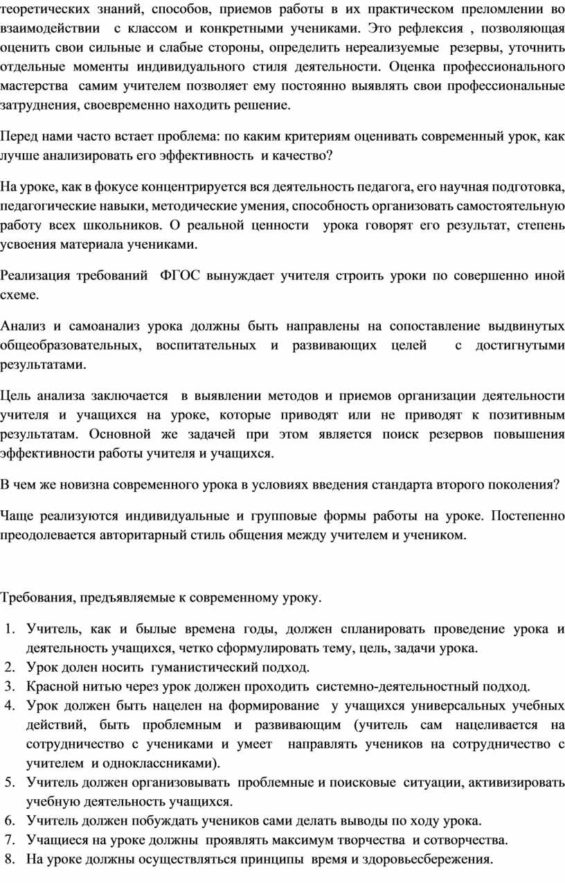 Совершенствование мастерства учителя и учебного процесса во многом зависит от грамотно организованного самоанализа урока. Учитель испытывает затруднения в моделировании и конструировании современного урока. Именно самоанализ позволит ему выявить причины недостаточной эффективности решения тех или иных учебно- воспитательных задач на уроках, принять и во внимание при дальнейшем проектировании образовательного процесса.