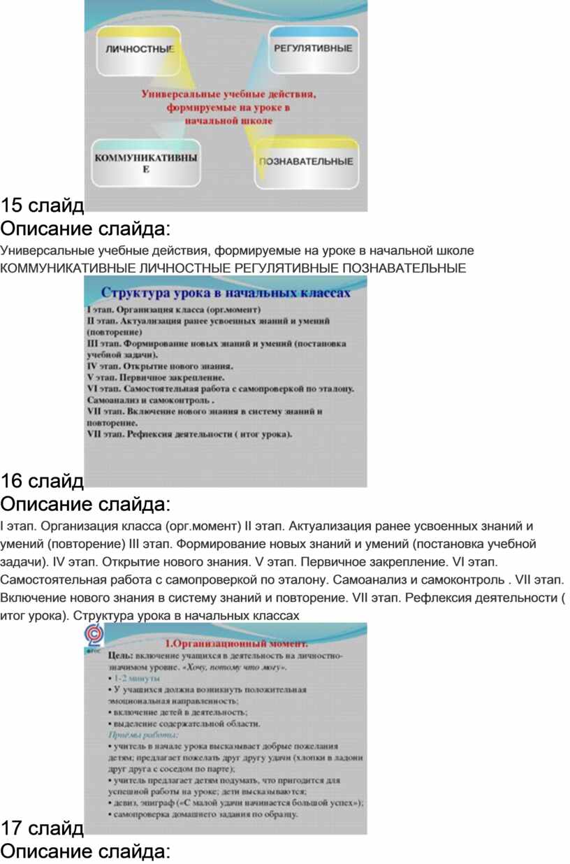 I этап. Организация класса (орг.момент) II этап. Актуализация ранее усвоенных знаний и умений (повторение) III этап. Формирование новых знаний и умений (постановка учебной задачи). IV этап. Открытие нового знания. V этап. Первичное закрепление. VI этап. Самостоятельная работа с самопроверкой по эталону. Самоанализ и самоконтроль . VII этап. Включение нового знания в систему знаний и повторение. VII этап. Рефлексия деятельности ( итог урока). Структура урока в начальных классах