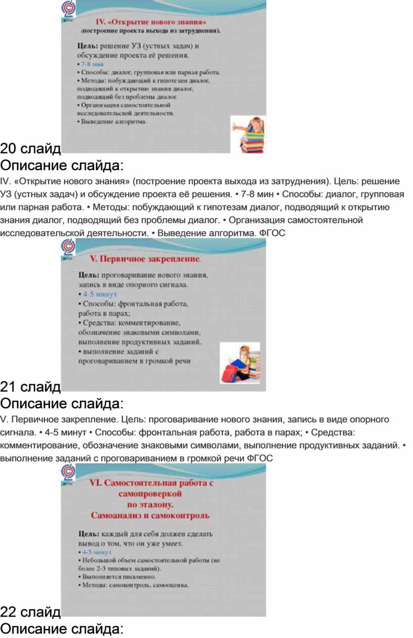 IV. «Открытие нового знания» (построение проекта выхода из затруднения). Цель: решение УЗ (устных задач) и обсуждение проекта её решения. • 7-8 мин • Способы: диалог, групповая или парная работа. • Методы: побуждающий к гипотезам диалог, подводящий к открытию знания диалог, подводящий без проблемы диалог. • Организация самостоятельной исследовательской деятельности. • Выведение алгоритма. ФГОС