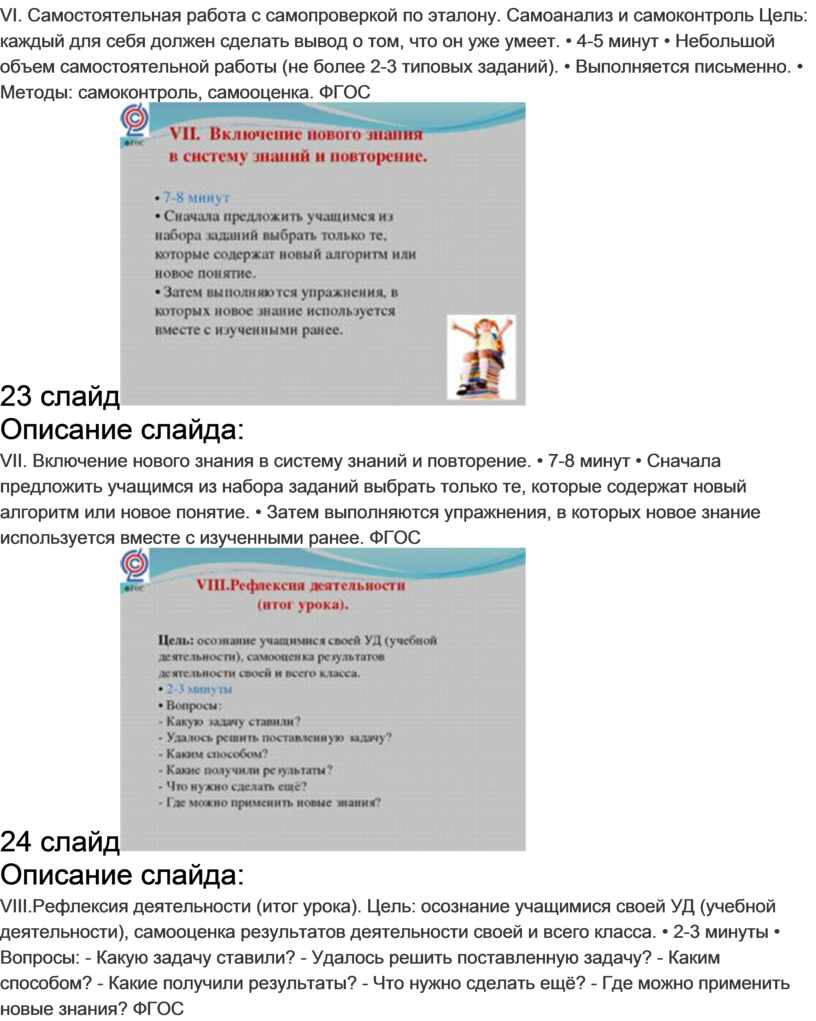 VII. Включение нового знания в систему знаний и повторение. • 7-8 минут • Сначала предложить учащимся из набора заданий выбрать только те, которые содержат новый алгоритм или новое понятие. • Затем выполняются упражнения, в которых новое знание используется вместе с изученными ранее. ФГОС