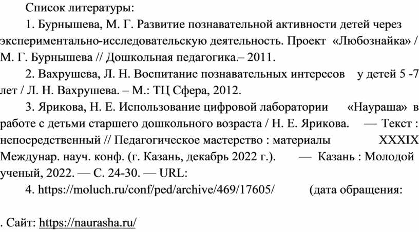 1. Бурнышева, М. Г. Развитие познавательной активности детей через экспериментально-исследовательскую деятельность. Проект «Любознайка» / М. Г. Бурнышева // Дошкольная педагогика. – 2011.