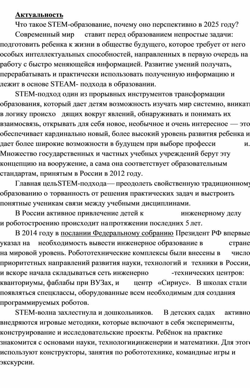 Современный мир ставит перед образованием непростые задачи: подготовить ребенка к жизни в обществе будущего, которое требует от него особых интеллектуальных способностей, направленных в первую очередь на работу с быстро меняющейся информацией. Развитие умений получать, перерабатывать и практически использовать полученную информацию и лежит в основе STEАM- подхода в образовании.