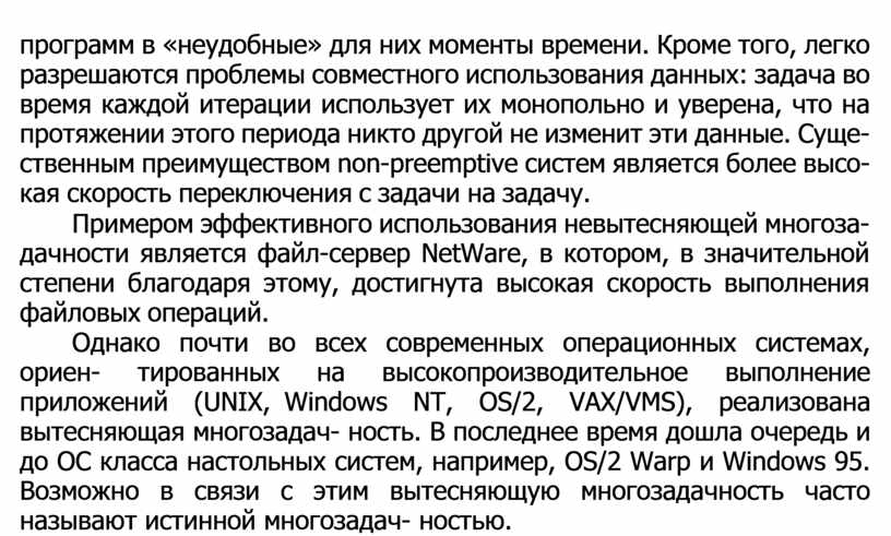 Примером эффективного использования невытесняющей многоза- дачности является файл-сервер NetWare, в котором, в значительной степени благодаря этому, достигнута высокая скорость выполнения файловых операций.