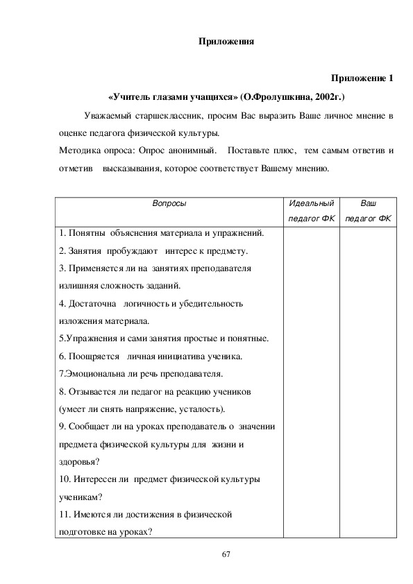 1.Анализировать роль преподавания предмета «физическая культура» в