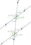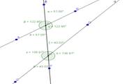 Изучение нового материала. Практическая работа. Учащиеся поделены на 4 группы. Каждая группа имеет ноутбук с установленной программой Geogebra. Предложить построить в программе: 1,3 группе - 2 параллельные прямые и секущую, 2, 4 группе - 2 прямые, которые не параллельны и секущую Обозначить образованные углы.