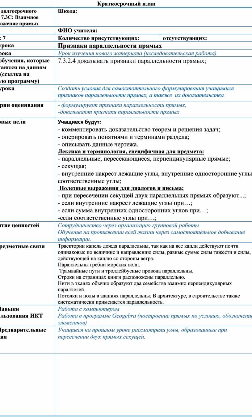 Учащиеся будут: - комментировать доказательство теорем и решения задач; - оперировать понятиями и терминами раздела; - описывать данные чертежа. Лексика и терминология, специфичная для предмета: - параллельные, пересекающиеся, перпендикулярные прямые; - секущая; - внутренние накрест лежащие углы, внутренние односторонние углы, соответственные углы; Полезные выражения для диалогов и письма: - при пересечении секущей двух параллельных прямых образуют...; - если внутренние накрест лежащие углы при…; - если сумма внутренних односторонних углов при…; -если соответственные углы при…; |