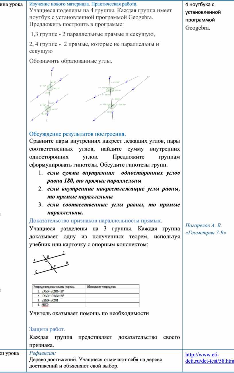 Сравните пары внутренних накрест лежащих углов, пары соответственных углов, найдите сумму внутренних односторонних углов. Предложите группам сформулировать гипотезы. Обсудите гипотезы групп. 1. если сумма внутренних односторонних углов равна 180, то прямые параллельны 2. если внутренние накрестлежащие углы равны, то прямые параллельны 3. если соотвественные углы равны, то прямые параллельны. Доказательство признаков параллельности прямых. Учащиеся разделены на 3 группы. Каждая группа доказывает одну из полученных теорем, используя учебник или карточку с опорным конспектом: