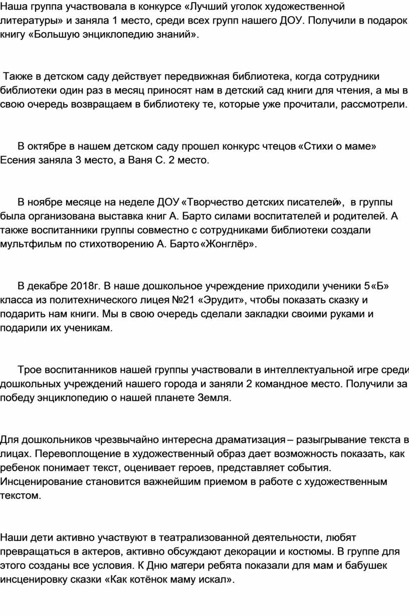Наша группа участвовала в конкурсе «Лучший уголок художественной литературы» и заняла 1 место, среди всех групп нашего ДОУ. Получили в подарок книгу «Большую энциклопедию знаний».