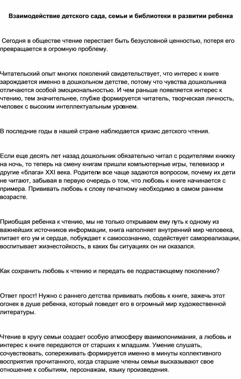 Взаимодействие детского сада, семьи и библиотеки в развитии ребенка
