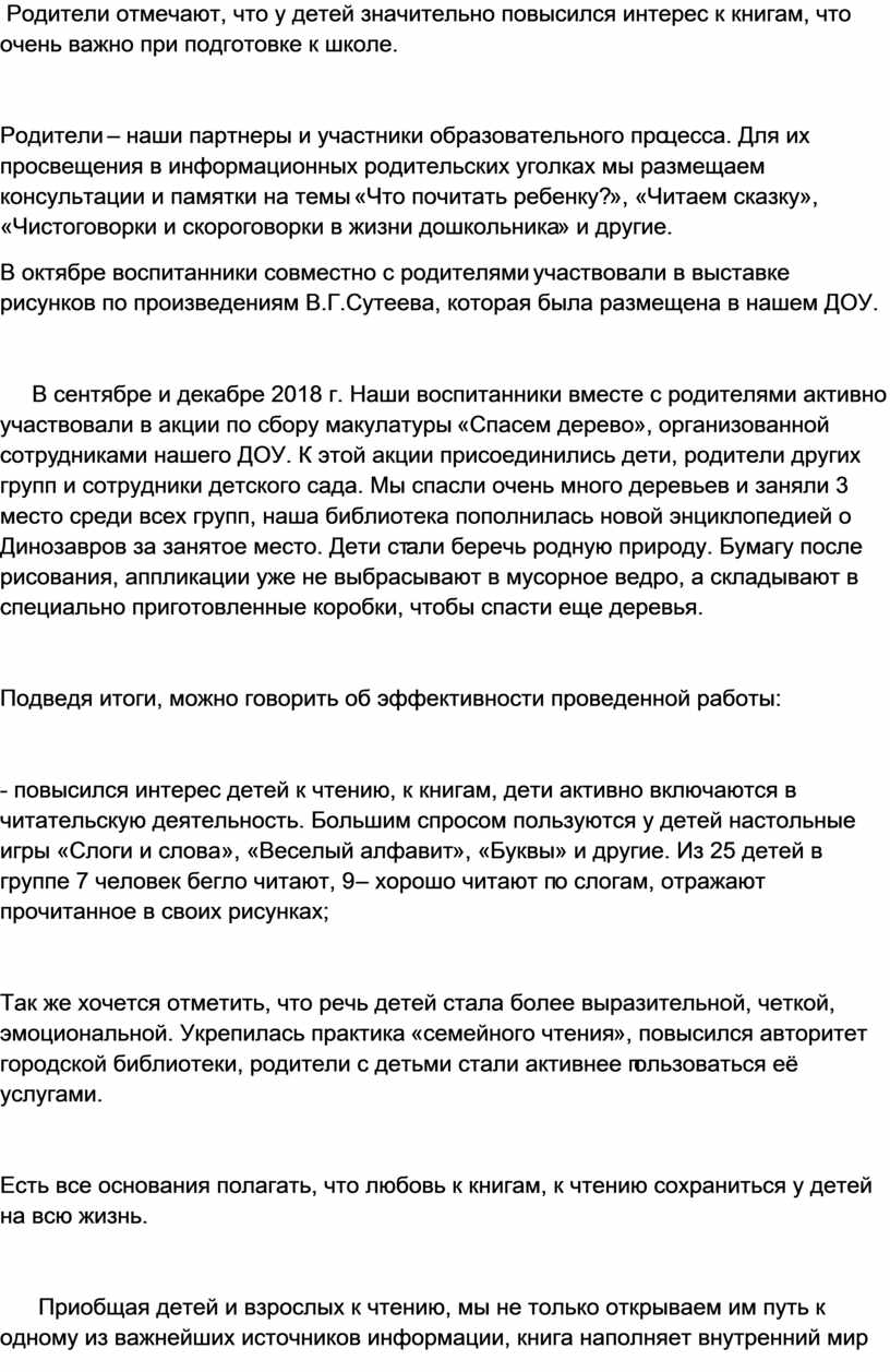 Так же хочется отметить, что речь детей стала более выразительной, четкой, эмоциональной. Укрепилась практика «семейного чтения», повысился авторитет городской библиотеки, родители с детьми стали активнее пользоваться её услугами.