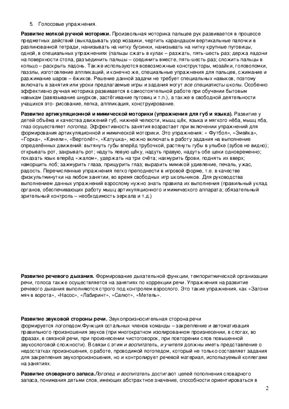 речи, голоса также осуществляется на занятиях по коррекции речи. Упражнения на развитие