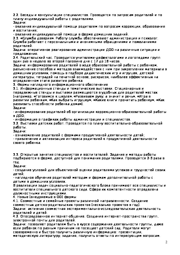 - определение оценки родителями работы ДОО.2.2. Беседы и консультации специалистов. Проводятся по запросам родителей и по