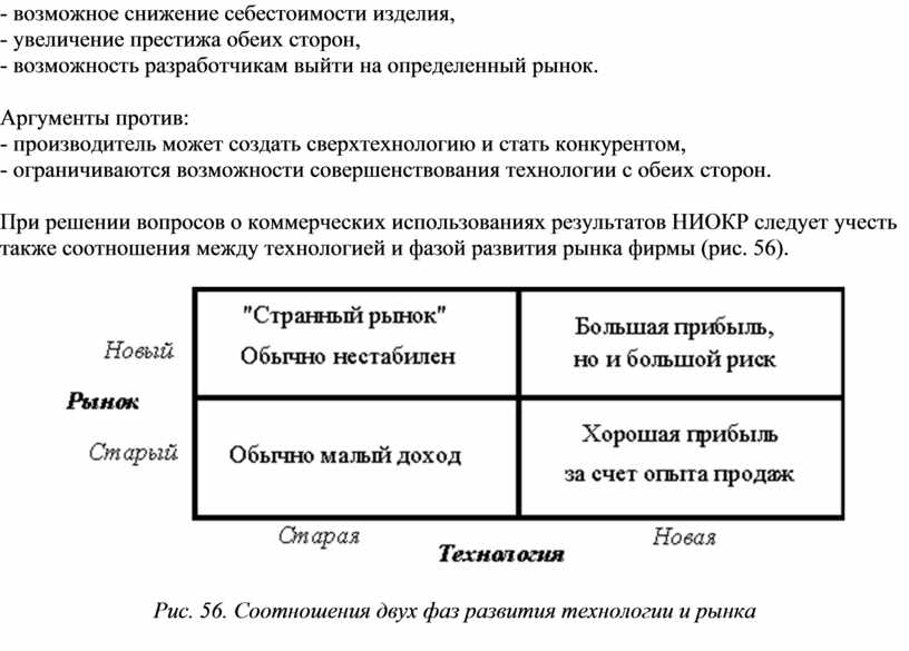 При решении вопросов о коммерческих использованиях результатов НИОКР следует учесть также соотношения между технологией и фазой развития рынка фирмы (рис. 56).