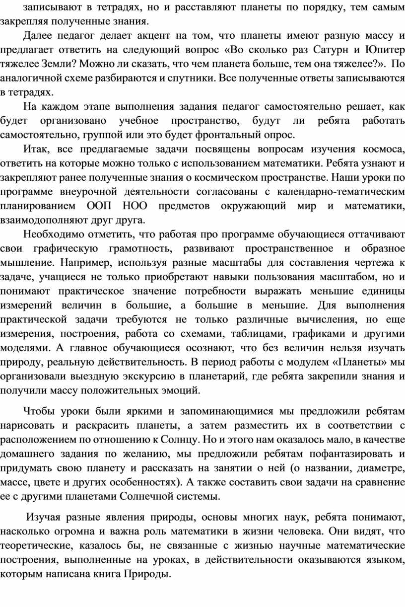 Итак, все предлагаемые задачи посвящены вопросам изучения космоса, ответить на которые можно только с использованием математики. Ребята узнают и закрепляют ранее полученные знания о космическом пространстве. Наши уроки по программе внеурочной деятельности согласованы с календарно-тематическим планированием ООП НОО предметов окружающий мир и математики, взаимодополняют друг друга.