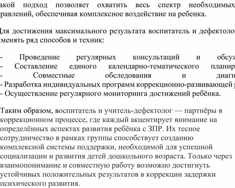 Таким образом, воспитатель и учитель-дефектолог — партнёры в коррекционном процессе, где каждый акцентирует внимание на определённых аспектах развития ребёнка с ЗПР. Их тесное сотрудничество в рамках группы способствует созданию комплексной системы поддержки, необходимой для успешной социализации и развития детей дошкольного возраста. Только через взаимопонимание и совместную работу возможно достигнуть устойчивых положительных результатов в коррекции задержки психического развития.