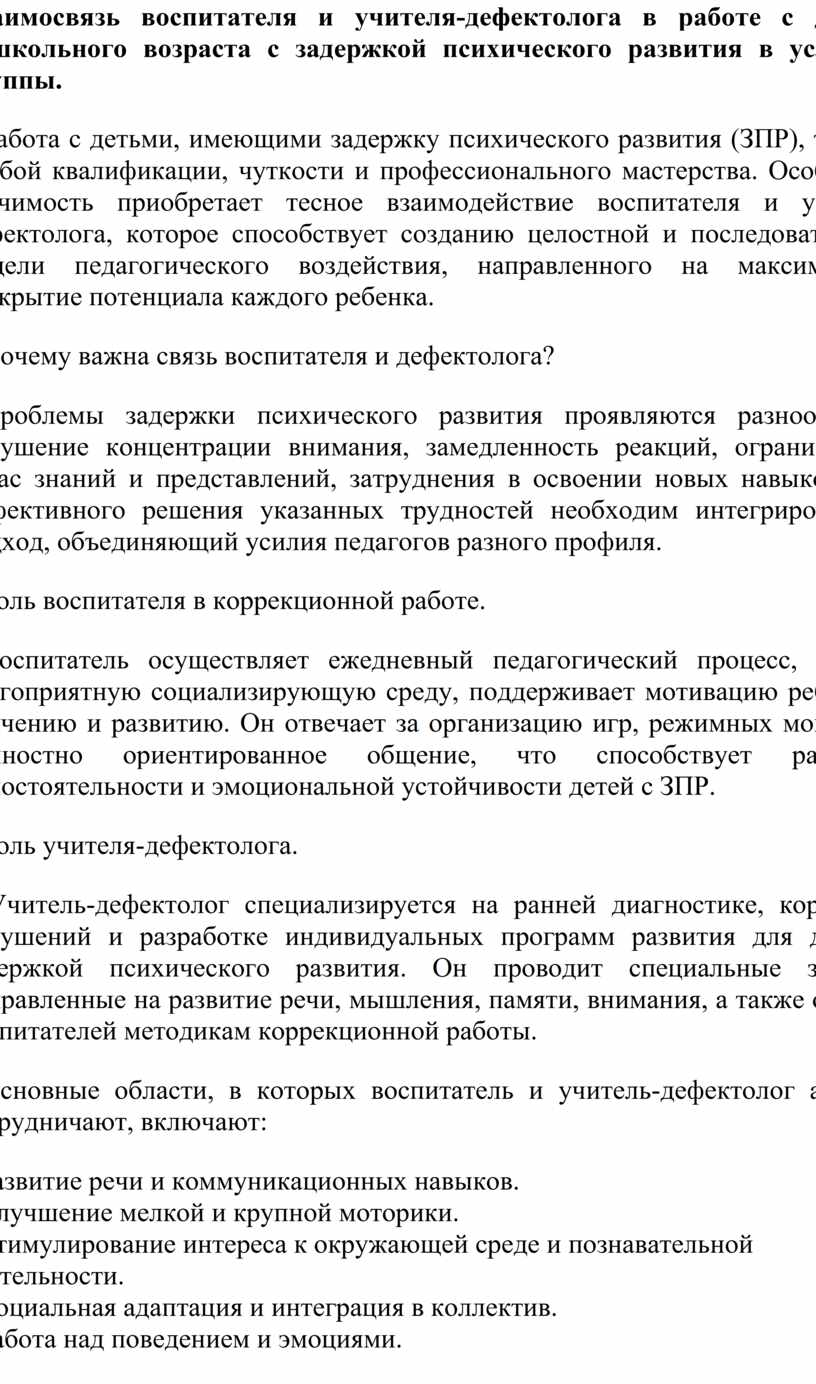 Работа с детьми, имеющими задержку психического развития (ЗПР), требует особой квалификации, чуткости и профессионального мастерства. Особенную значимость приобретает тесное взаимодействие воспитателя и учителя-дефектолога, которое способствует созданию целостной и последовательной модели педагогического воздействия, направленного на максимальное раскрытие потенциала каждого ребенка.