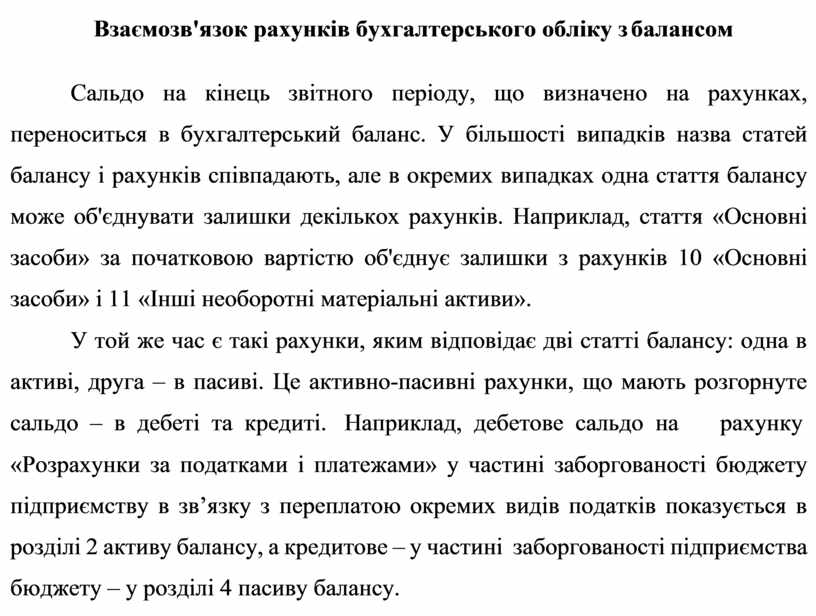 У той же час є такі рахунки, яким відповідає дві статті балансу: одна в активі, друга – в пасиві. Це активно-пасивні рахунки, що мають розгорнуте сальдо – в дебеті та кредиті. Наприклад, дебетове сальдо на рахунку