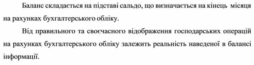 Баланс складається на підставі сальдо, що визначається на кінець місяця на рахунках бухгалтерського обліку.