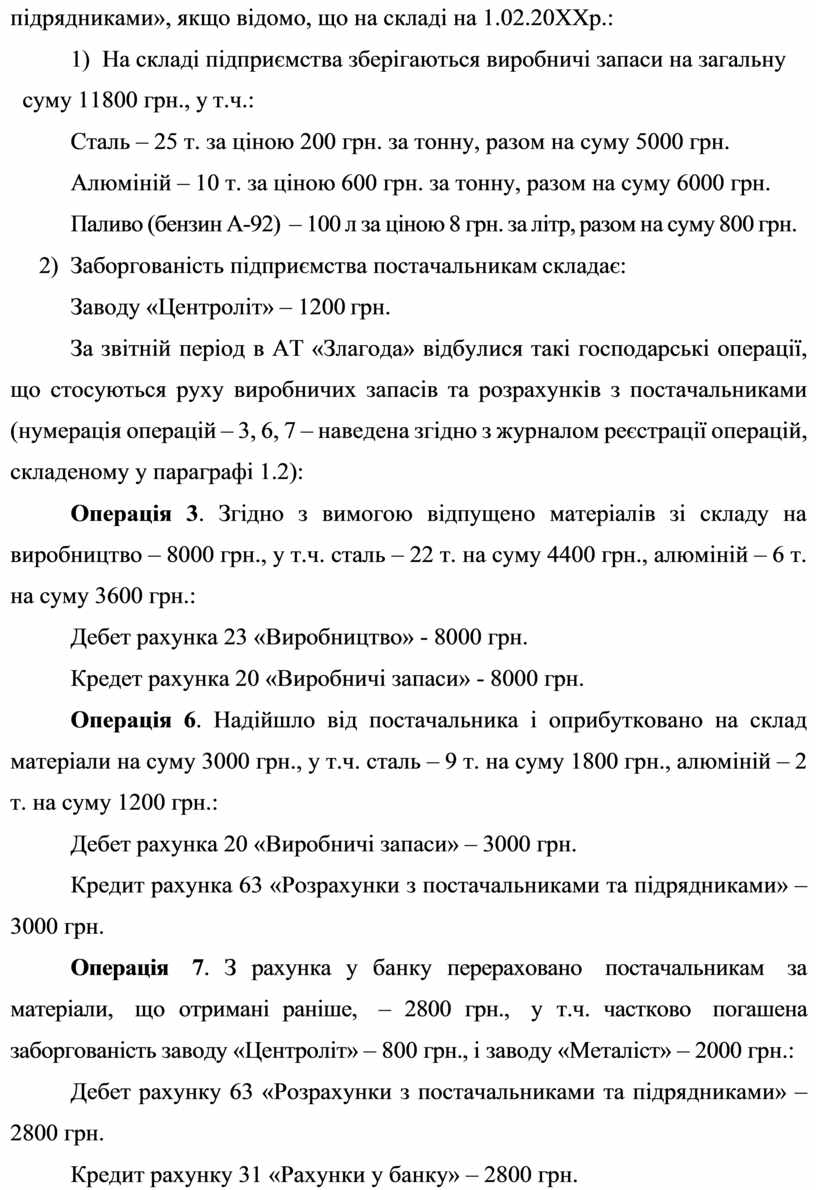 За звітній період в АТ «Злагода» відбулися такі господарські операції, що стосуються руху виробничих запасів та розрахунків з постачальниками (нумерація операцій – 3, 6, 7 – наведена згідно з журналом реєстрації операцій, складеному у параграфі 1.2):