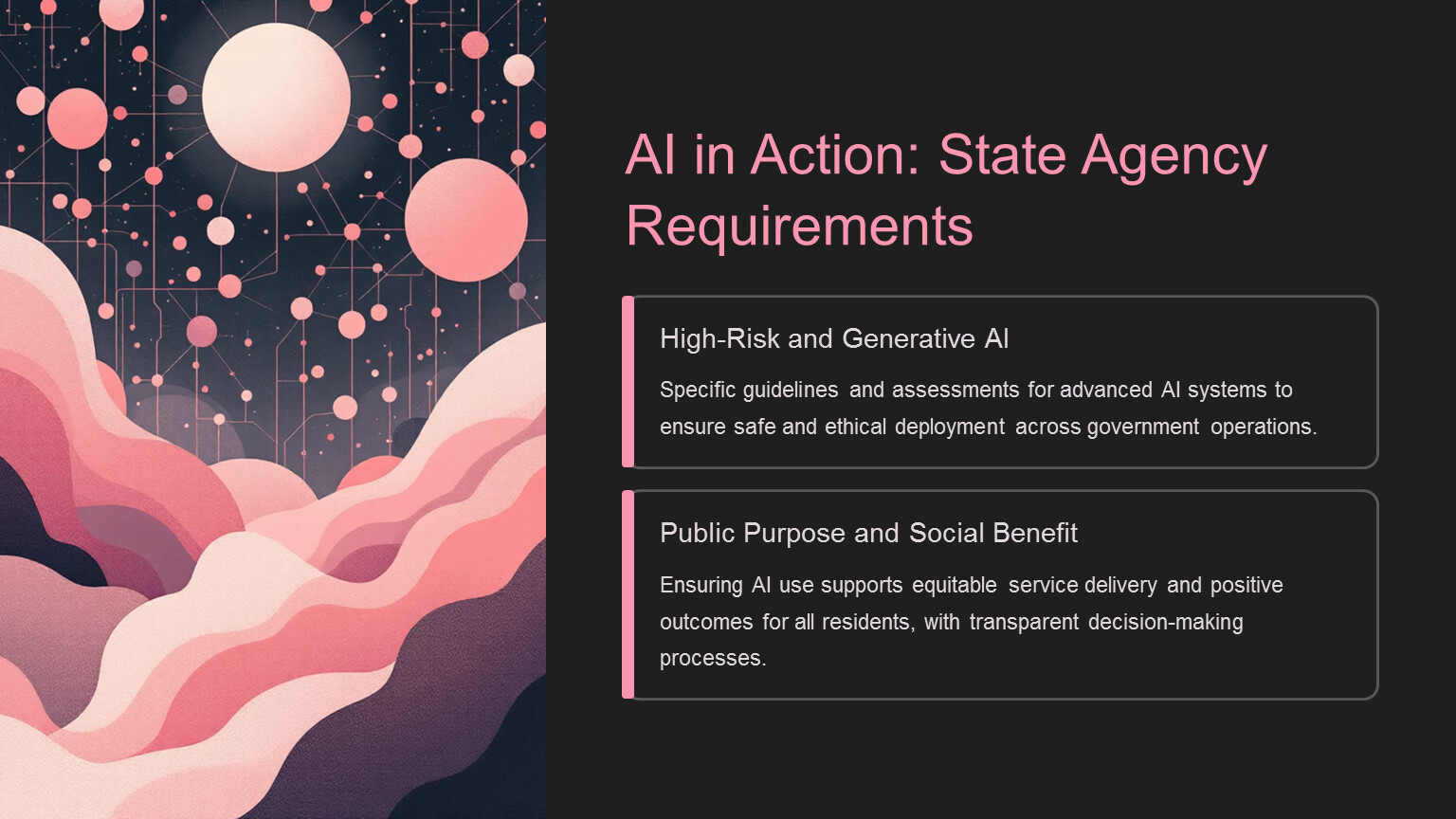 Focus on responsible AI use, risk assessments, transparency, and comprehensive training for state agencies.