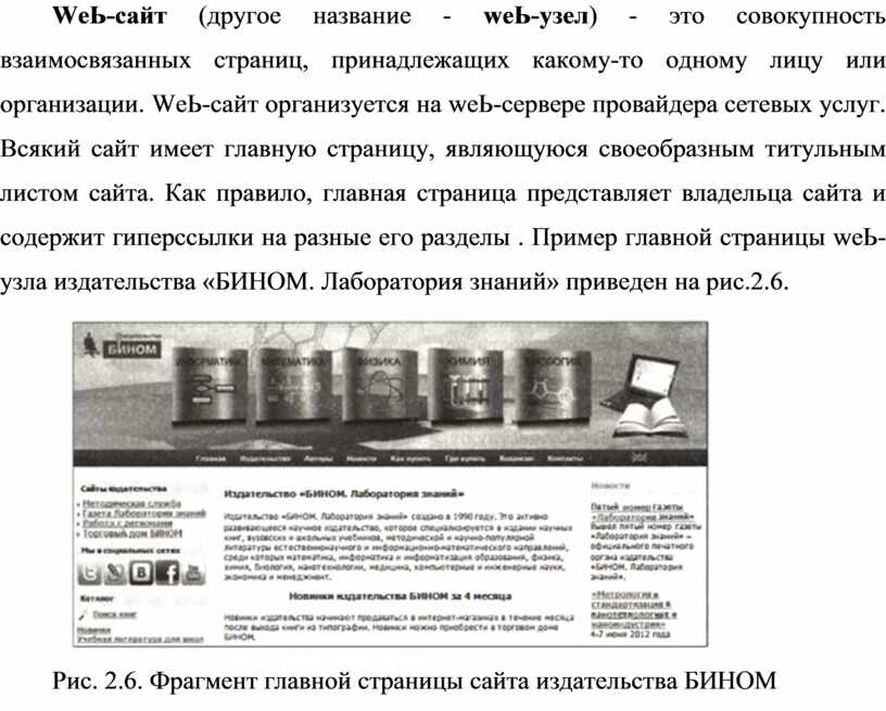 WеЬ-сайт (другое название - wеЬ-узел) - это совокупность взаимосвязанных страниц, принадлежащих какому-то одному лицу или организации. WеЬ-сайт организуется на wеЬ-сервере провайдера сетевых услуг. Всякий сайт имеет главную страницу, являющуюся своеобразным титульным листом сайта. Как правило, главная страница представляет владельца сайта и содержит гиперссылки на разные его разделы . Пример главной страницы wеЬ-узла издательства «БИНОМ. Лаборатория знаний» приведен на рис.2.6.