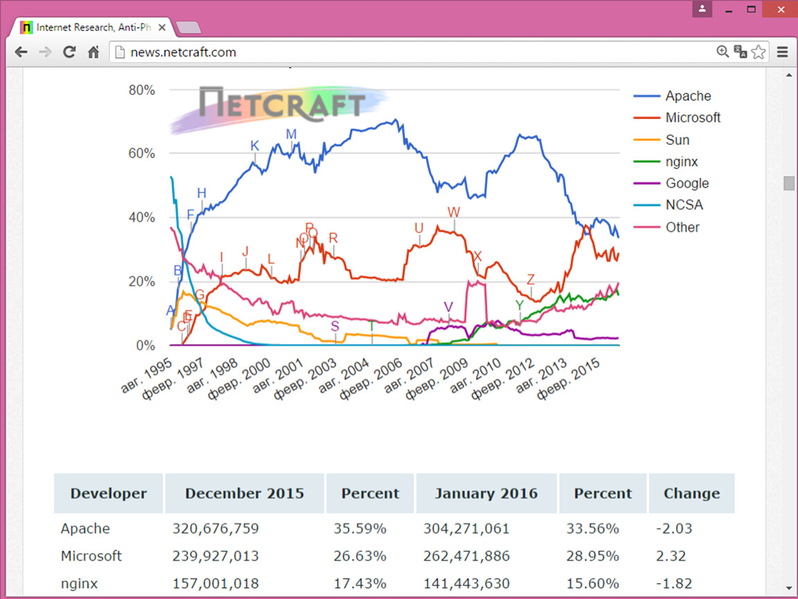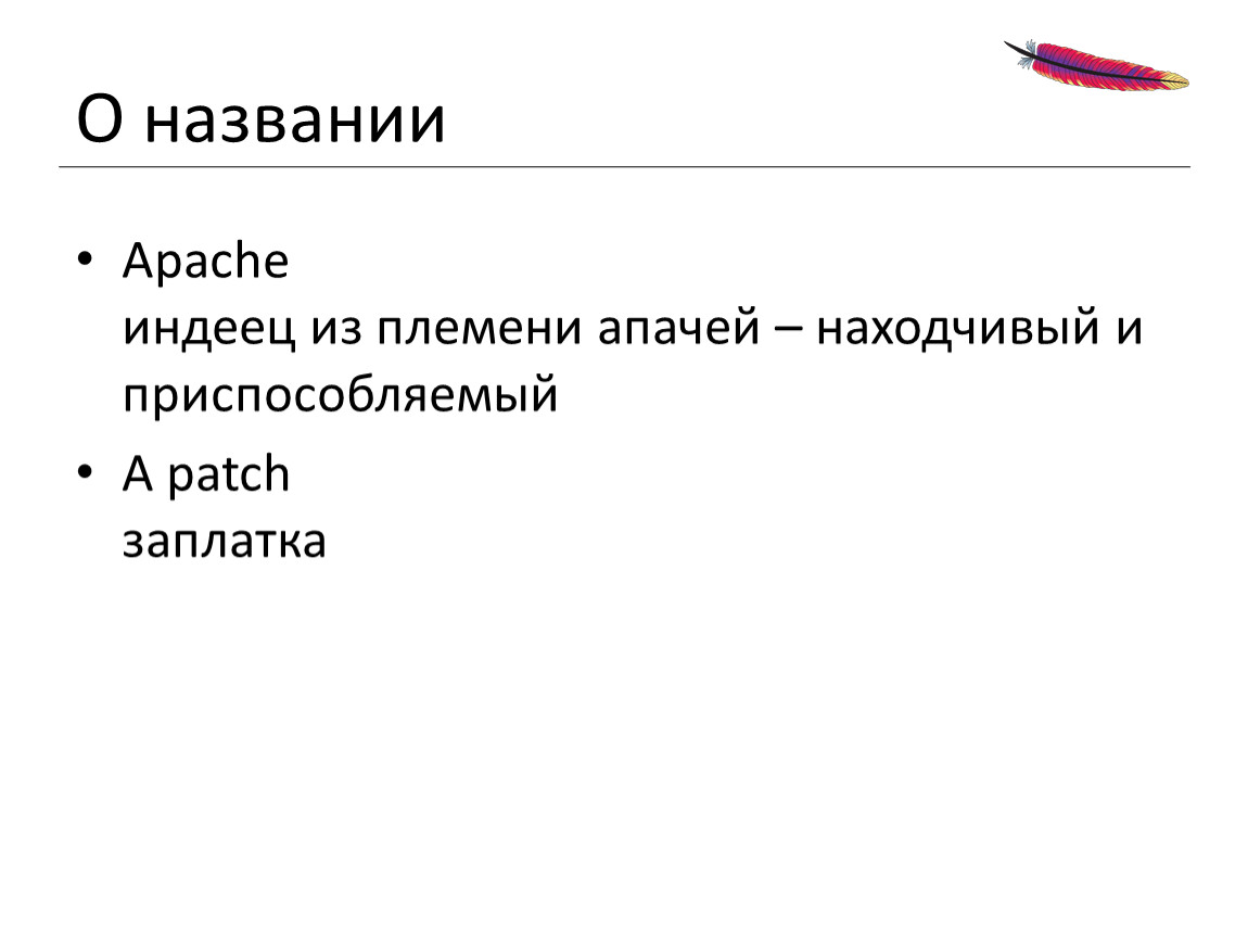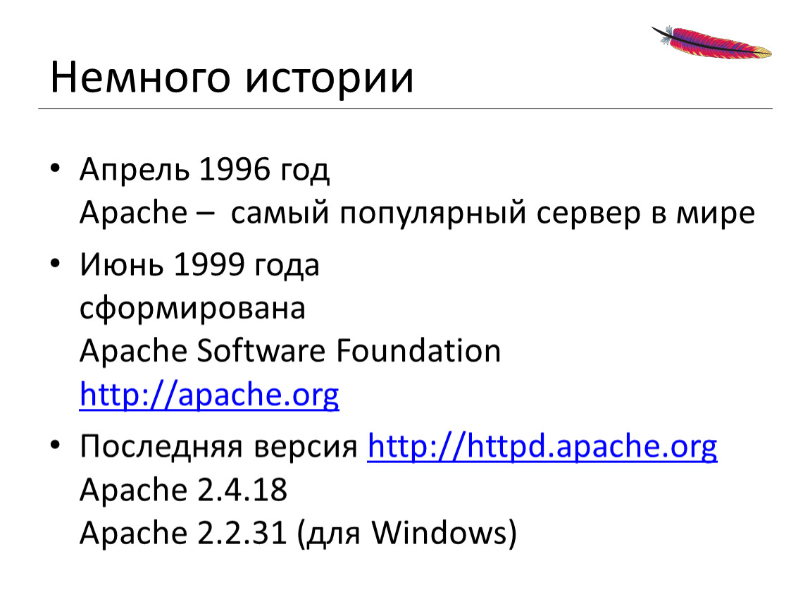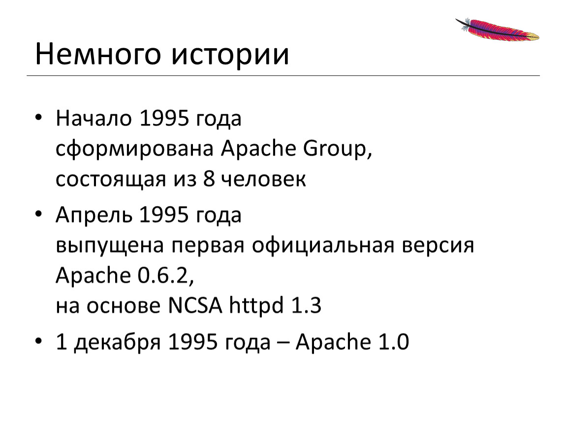 Апрель 1995 годавыпущена первая официальная версия Apache 0.6.2,на основе NCSA httpd 1.3