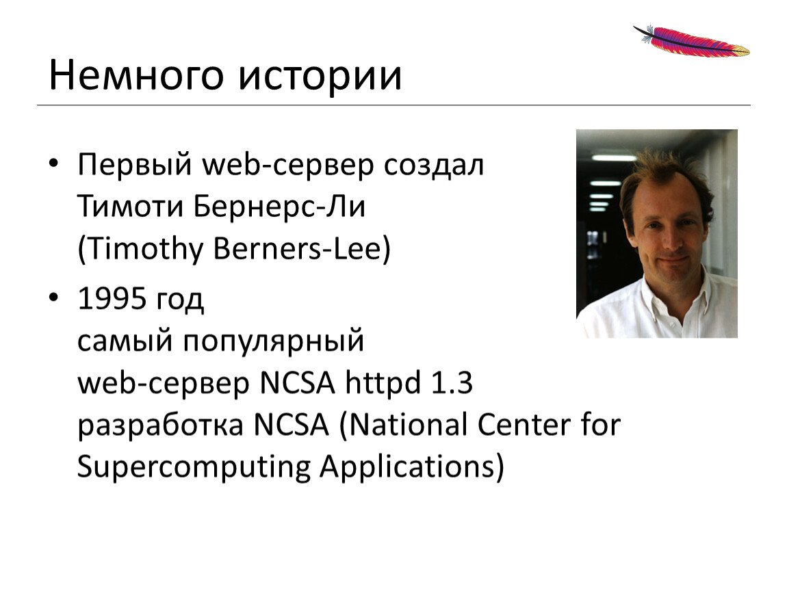 1995 годсамый популярныйweb-сервер NCSA httpd 1.3разработка NCSA (National Center for Supercomputing Applications)
