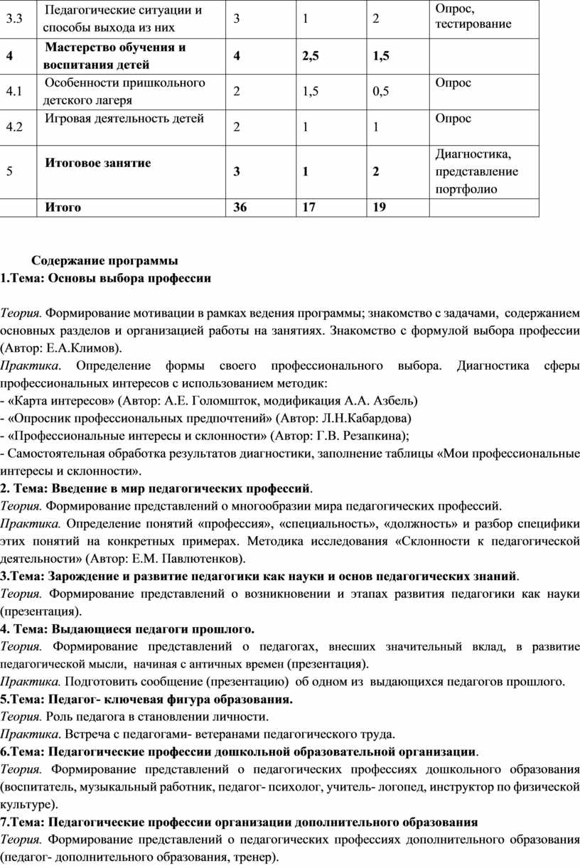 Данная программа представляет собой пропедевтический, профориентационный курс педагогического образования, который должен сформировать у школьников первоначальные общие представления о педагогической деятельности, необходимые для их осознанного выбора профессии педагога по окончании школы. На теоретическом и практическом уровне обучающиеся знакомятся с основами педагогической деятельности, приобретают необходимые знания, умения и навыки профессии педагога, развивают свои способности и организаторские умения.