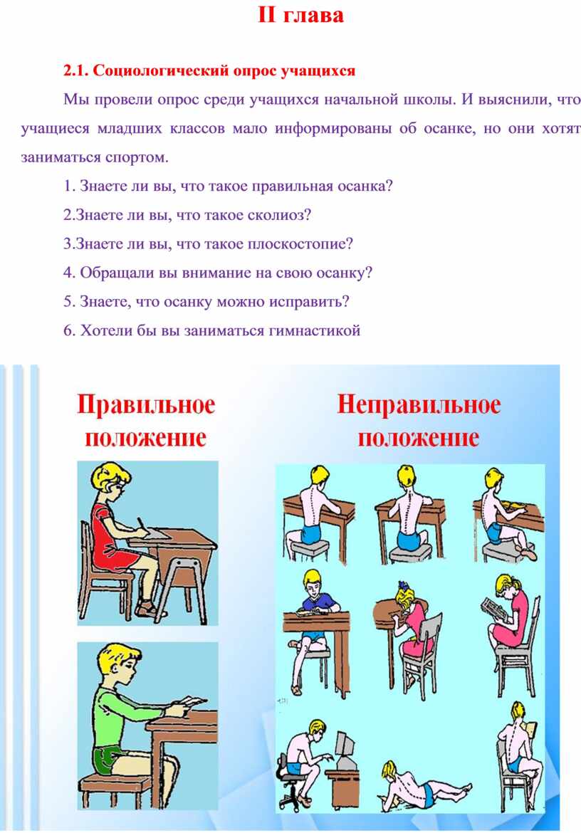 Вторая глава исследования посвящена физическим упражнениям и играм для формирования правильной осанки. Также рассмотрели упражнения для исправления и профилактике нарушений осанки; определили правильную и неправильную осанку у детей.