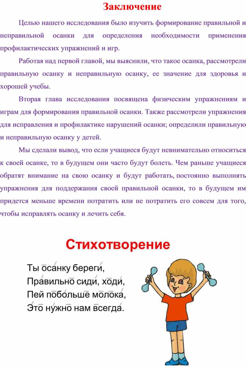 Работая над первой главой, мы выяснили, что такое осанка, рассмотрели правильную осанку и неправильную осанку, ее значение для здоровья и хорошей учебы.
