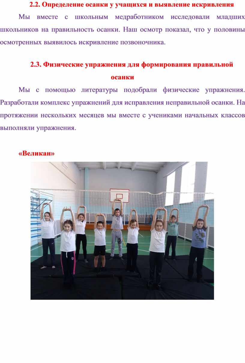 Мы с помощью литературы подобрали физические упражнения. Разработали комплекс упражнений для исправления неправильной осанки. На протяжении нескольких месяцев мы вместе с учениками начальных классов выполняли упражнения.