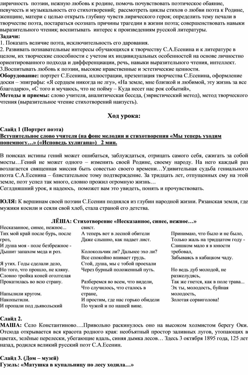 Цель: Познакомить обучающихся с жизнью и творчеством С.А.Есенина, заинтересовать учащихся личностью поэта, увлечь песенно-поэтическим творчеством поэта, обратить внимание на глубокую лиричность поэзии, нежную любовь к родине, помочь почувствовать поэтическое обаяние, певучесть и музыкальность его стихотворений; рассмотреть циклы стихов о любви поэта к Родине, женщине, матери с целью открыть глубину чувств лирического героя; определить тему печали в творчестве поэта, постараться осознать причины трагедии в жизни поэта; совершенствовать навыки выразительного чтения; воспитывать интерес к произведениям русской литературы.