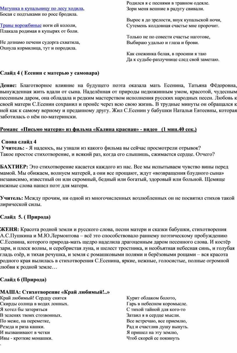 ЖЕНЯ: Красота родной земли и русского слова, песни матери и сказки бабушки, стихотворения А.С.Пушкина и М.Ю.Лермонтова – всё это способствовало раннему поэтическому пробуждению С.Есенина, которого природа-мать щедро наделила драгоценным даром песенного слова. И костёр зари, и плеск волны, и серебристая луна, и шелест тростника, и необъятная небесная синь, и голубая гладь озёр, и тихая речушка, и земля с ромашковыми полями и берёзовыми рощами – вся красота родного края вылилась в стихотворения С.Есенина, яркие, нежные, голосистые, полные огромной любви к родной земле…