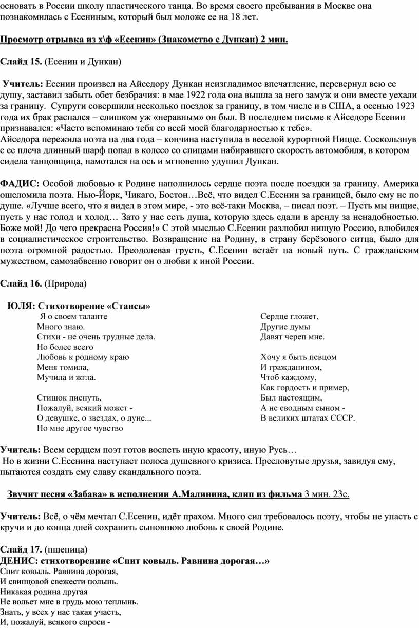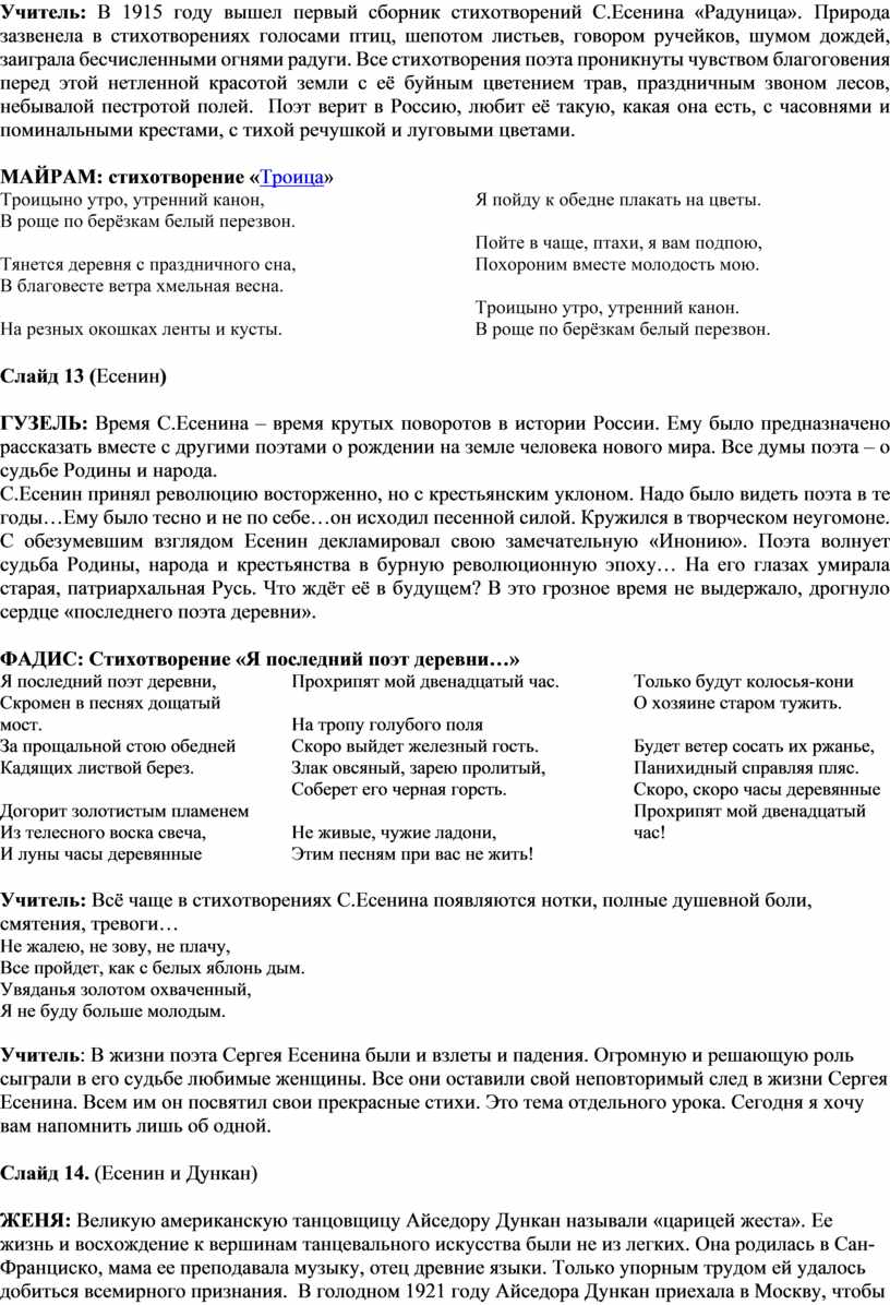 Учитель: Есенин произвел на Айседору Дункан неизгладимое впечатление, перевернул всю ее душу, заставил забыть обет безбрачия: в мае 1922 года она вышла за него замуж и они вместе уехали за границу. Супруги совершили несколько поездок за границу, в том числе и в США, а осенью 1923 года их брак распался – слишком уж «неравным» он был. В последнем письме к Айседоре Есенин признавался: «Часто вспоминаю тебя со всей моей благодарностью к тебе». Айседора пережила поэта на два года – кончина наступила в веселой курортной Ницце. Соскользнув с ее плеча длинный шарф попал в колесо со спицами набиравшего скорость автомобиля, в котором сидела танцовщица, намотался на ось и мгновенно удушил Дункан.
