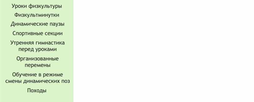 Уроки физкультуры Физкультминутки Динамические паузы Спортивные секции Утренняя гимнастика перед уроками Организованные перемены Обучение в режиме смены динамических поз Походы Внеурочная деятельность |