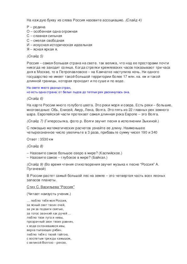 Какие ассоциации у вас с этим словом?На каждую букву из слова Россия назовите ассоциацию. (Слайд 4)