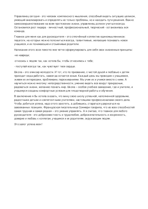 Эссе "Я и школа" - это размышление директора о современной школе и работе директора-управленца. Все мы хотим достичь успеха… Кто-то в учебе, кто-то в профессиональной деятельности, кто-то в воспитании детей, кто-то в получении финансовой независимости. Мы стараемся достичь намеченных целей и осуществить собственные жизненные планы. Мы стремимся, чтобы город, в котором мы живем, был передовым, перспективным, мирным. Мне несказанно повезло в жизни. Много лет назад я выбрала профессию учителя, без которой не мыслю себя в этом мире, работаю в своем родном городе, в своей родной школе, где училась, где учились мои дети, где все пропитано духом особой духовной культуры.эссе